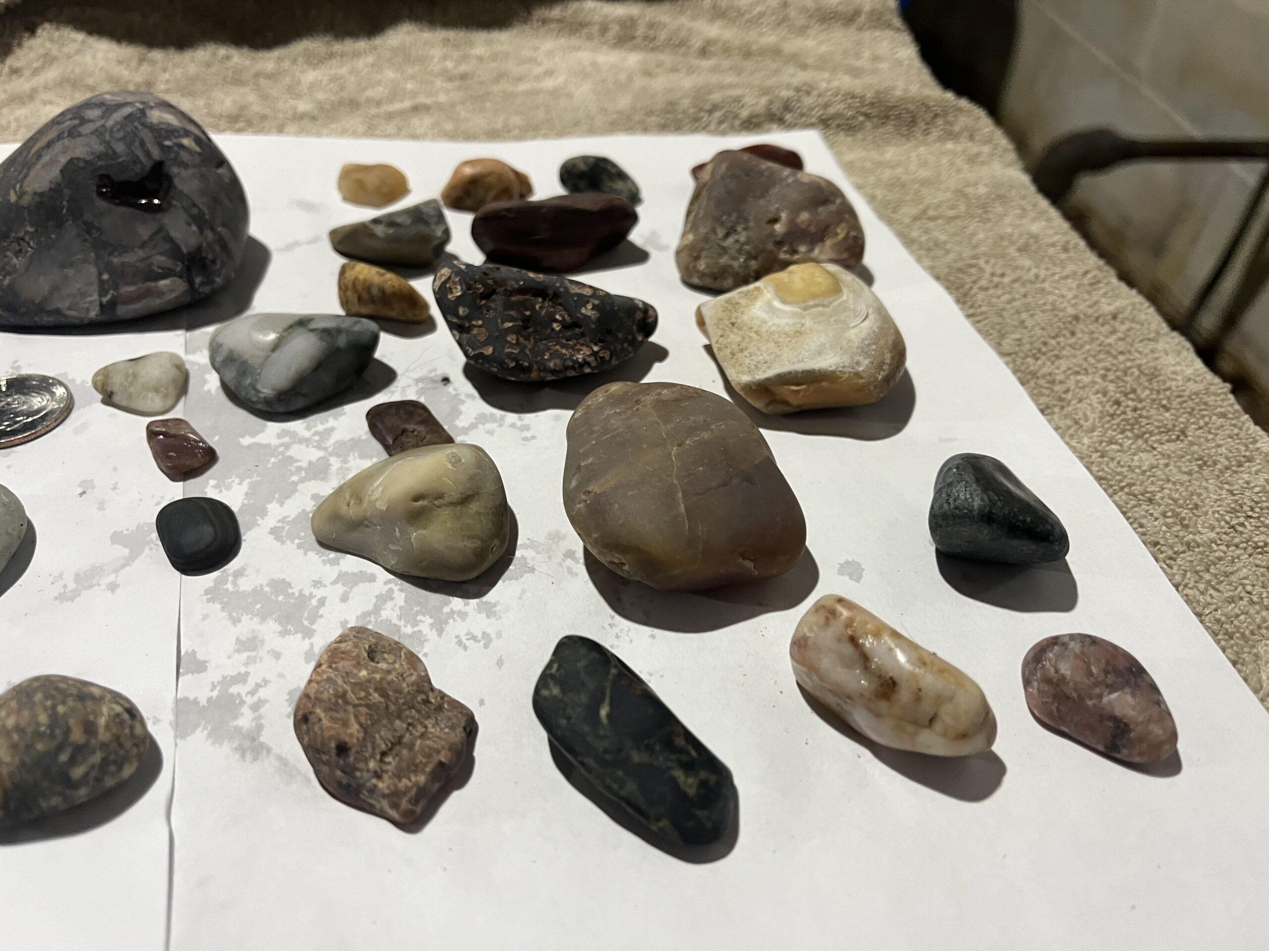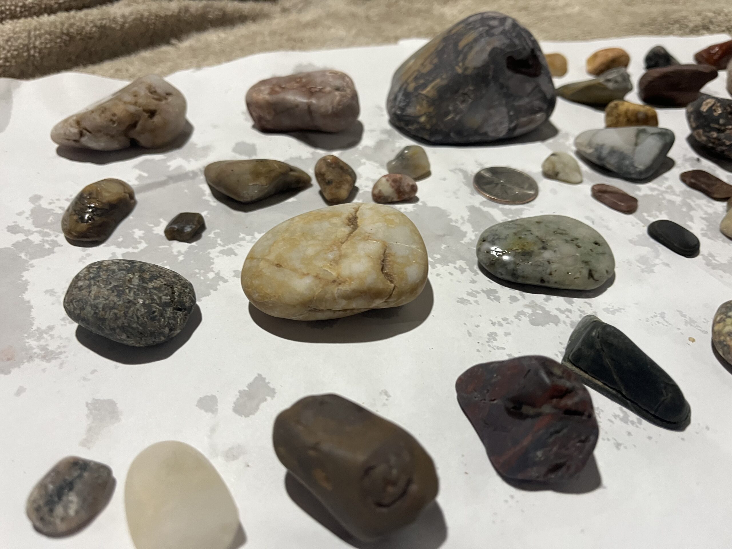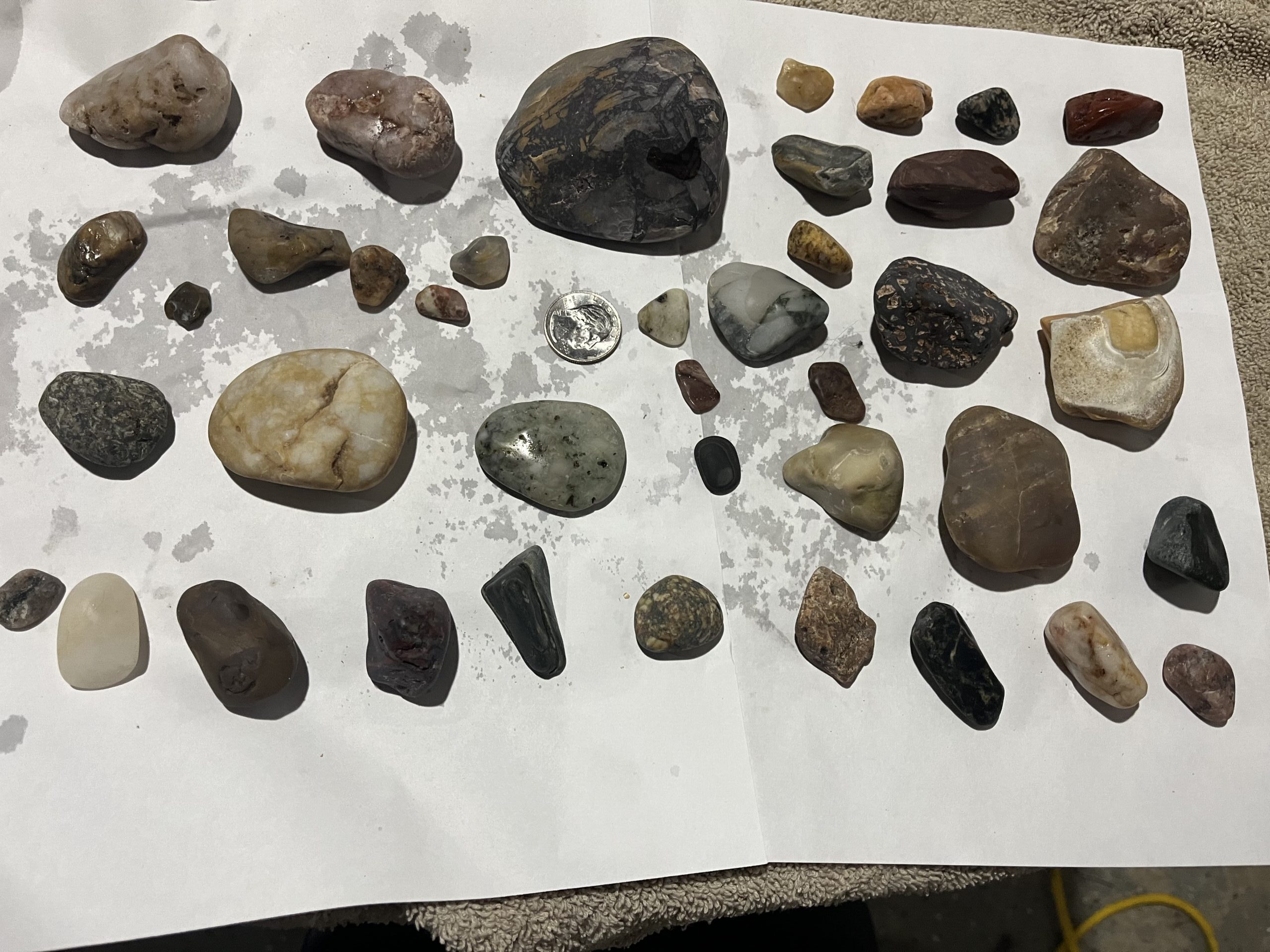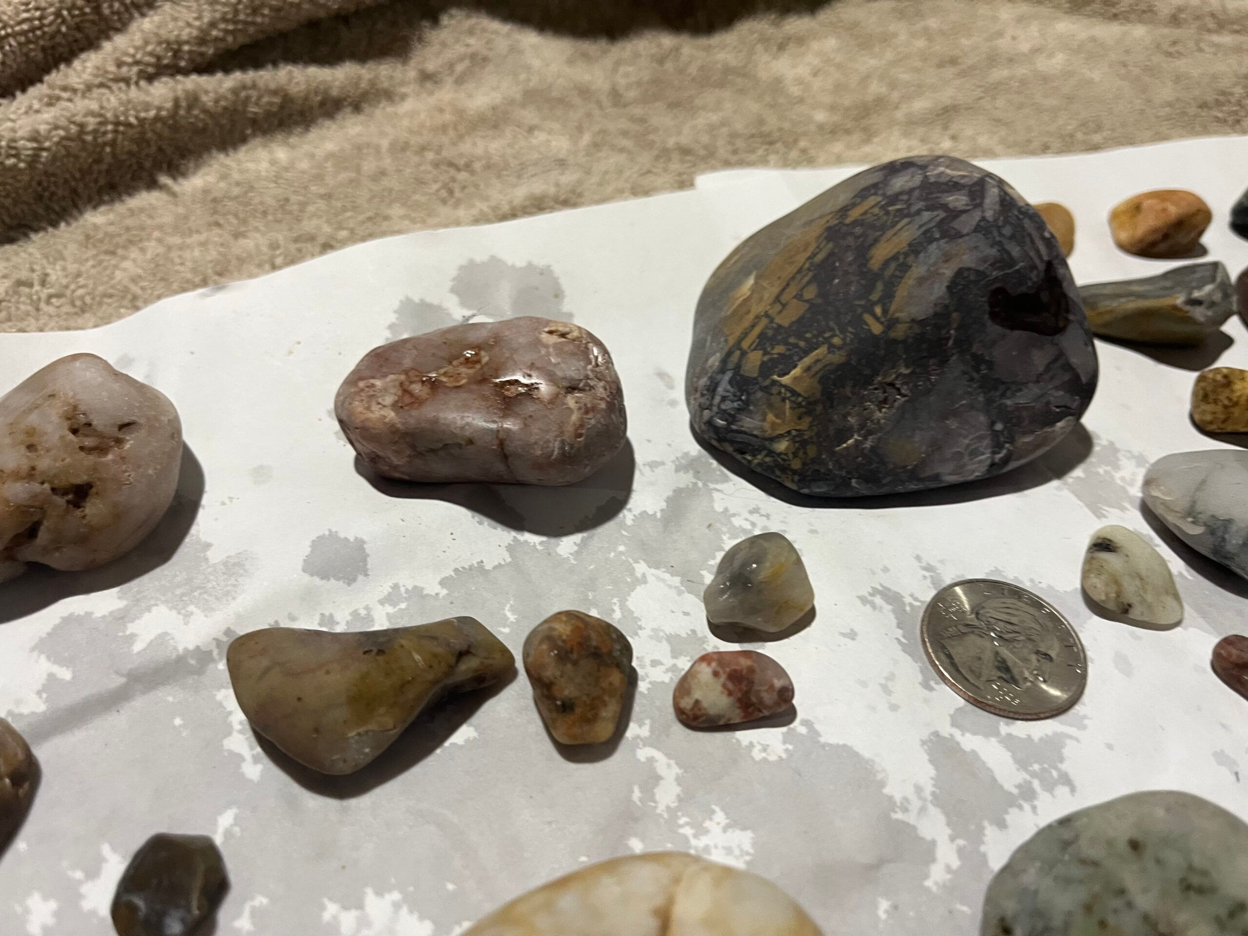 These are pictures of some of the rocks before I tumbled them. The quarter in some of the pictures is to help you see the size of the rocks.