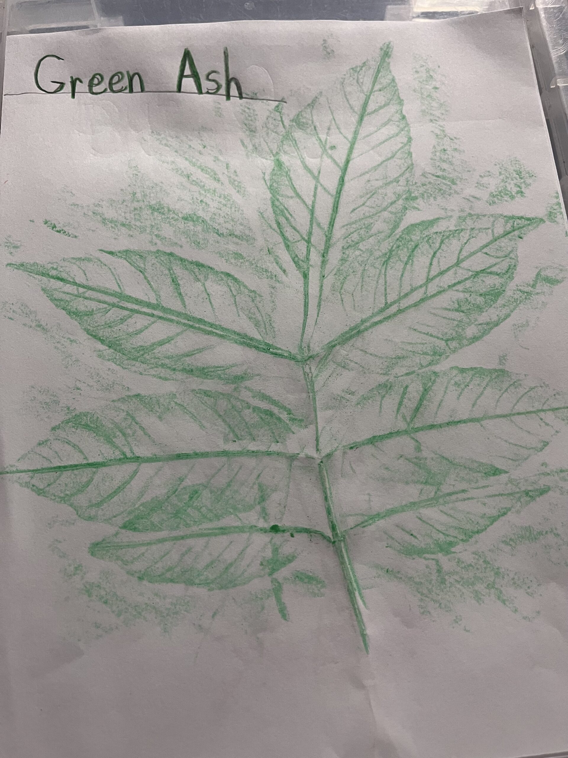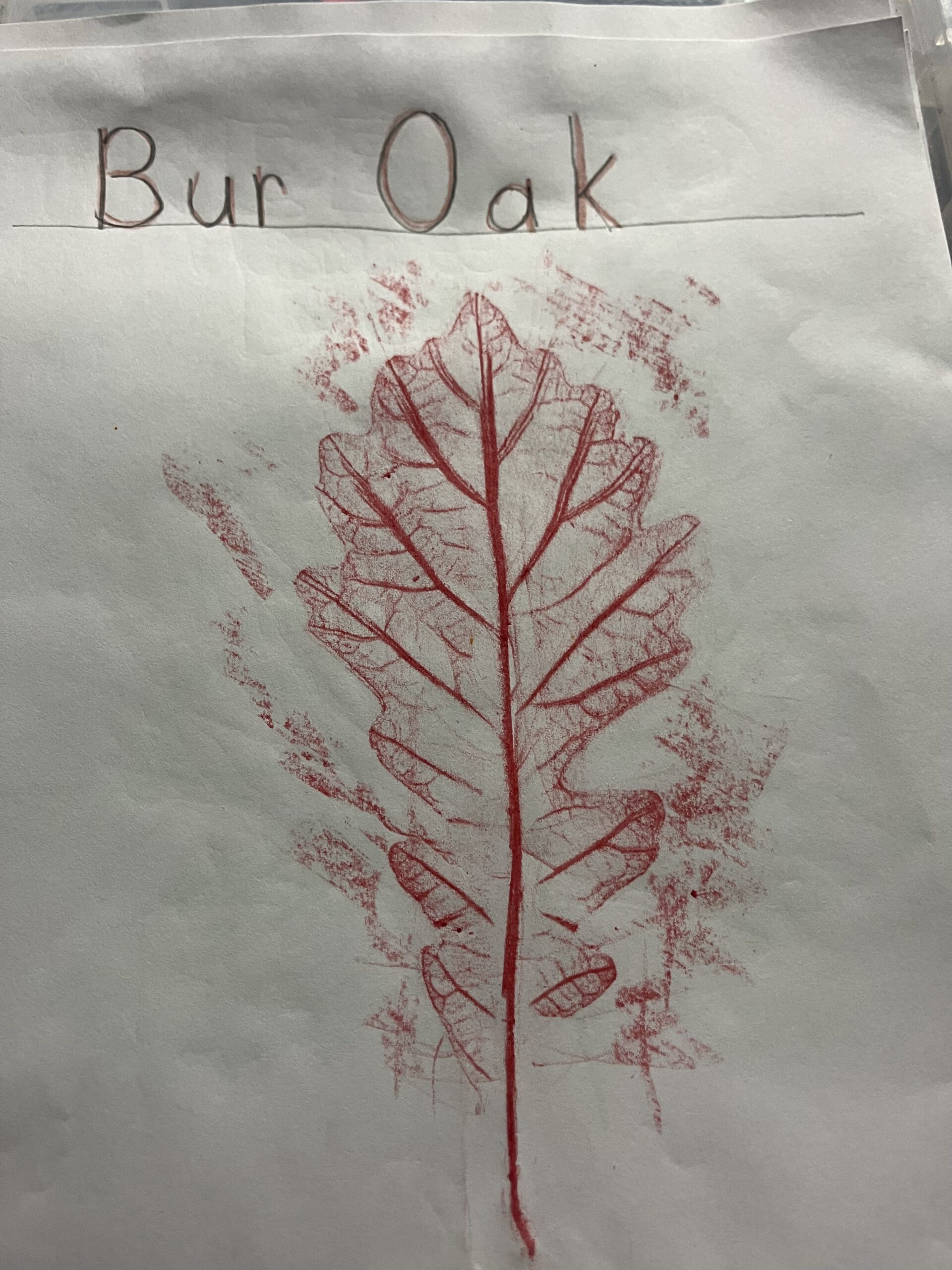 Bur Oak Leaf on hard flat surface Hold down the leaf and paper with one hand and use the other to hold the crayon on the side rubbing from the middle outward start of leaf rubbing Finished Bur Oak leaf rubbing Finished leaf rubbing of a Bur Oak with name of tree on the paper - Use the side of the crayon and rub from the middle of the leaf outward toward the edge of the leaf. Keep repeating this moving from the middle to the outer edges until the whole leaf is showing. Make sure you get the edges and all the veins in the leaf. The details are important. I would even use the same color crayon that the leaf happens to be, if the leaf has changed color. That is why fall is a good time to do this activity. The leaf rubbing should be demonstrated depending on who is doing the project. Many kids who have never done rubbings before will try to use the tip of the crayon and it doesn’t work out well. Doing compound leaves are challenging, so trees like ash, box elder, or black walnut will be harder to do. Especially if the compound leaf has many leaflets that make up the whole leaf.