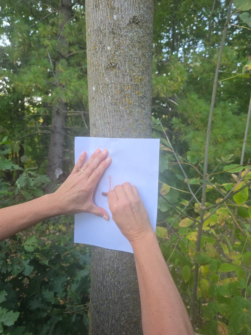 - You could do a bark rubbing for each tree leaf you’ve done. A bark rubbing needs to be done on the tree, so bring the paper with you to the tree and hold it in one place on the tree trunk. Use the side of a crayon and rub back and forth on the paper. It will turn out better if you don’t let the paper move around when doing the rubbing.