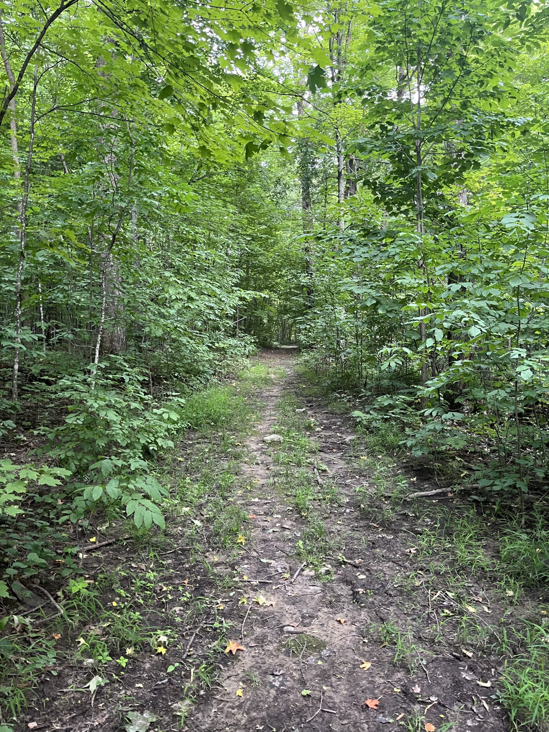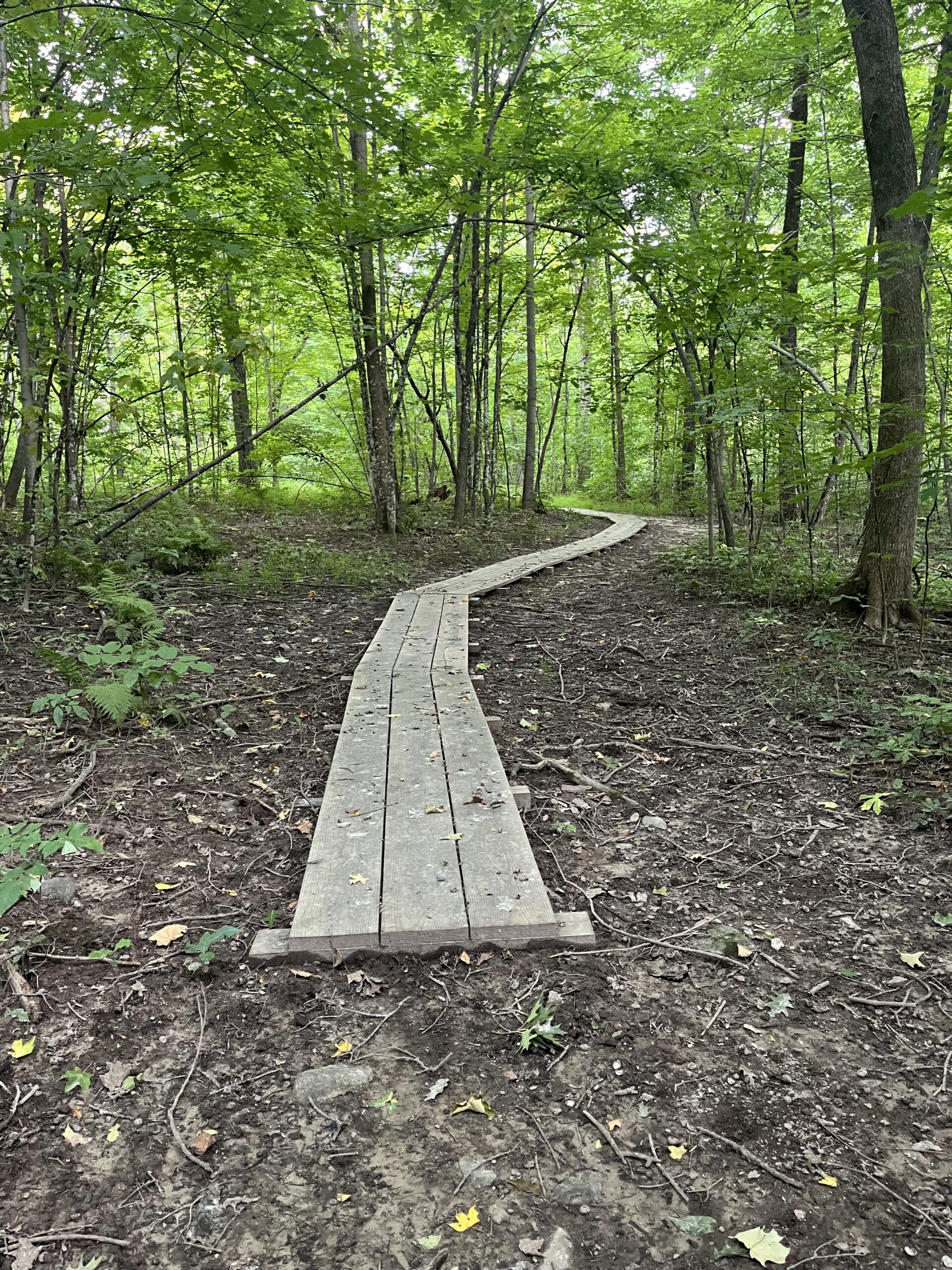 The trail starts on a dirt path, but it eventually will turn into a wood boardwalk. The boardwalk is nice because it allows you to not walk on the plants and not in the mud. Eventually the boardwalk turns back into a dirt path. Then after a little while, the dirt path will reach the other end of the parking lot. The path is less than a mile long. It is also very flat terrain. You will not need to go up or down any steep hills. This is a good starting path, if you don’t have a lot of stamina to walk a long way. You might have to step over or go around a down tree. I’m not sure how often people maintain the path.